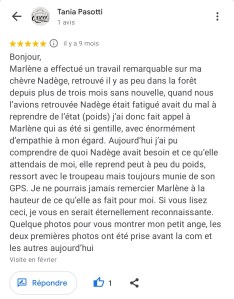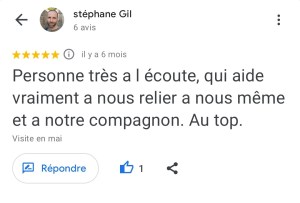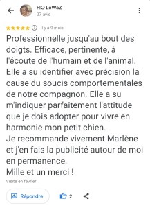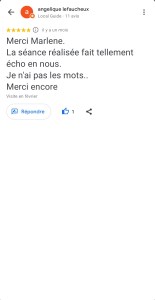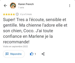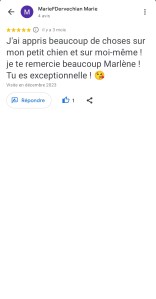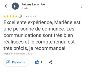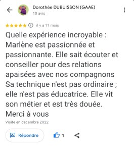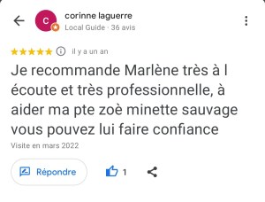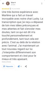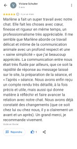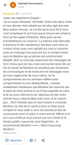 « Juste une expérience Dingue ! Mais quelle sacrée enchanteresse j’ai croisé là ! La séance s’est déroulée à distance et très rapidement, Marlène s’est mise en contact direct avec mon adopté qui nous a transmis juste un message très puissant par le compte rendu reçu de Marlène qui je précise est extrêmement détaillé. Bref ce n’est pas seulement des messages de mon minou que j’ai reçu mais une sacrée leçon de vie ! Car le travail de Marlène ne constitue pas seulement de communiquer et de transcrire les messages mais de nous rapprocher de nous même, car le comportement de nos animaux reflète notre comportement ou nos déséquilibres. Marlène fait ressortir par le biais de notre animal ce qu’il faut regarder en nous et là où nous cherchons les réponses et bien notre animal nous y répond déjà mais nous ne le voyons pas… Bref n’hésitez pas un seul instant à contacter Marlène car elle est la seule a faire un bilan aussi complet et nous aider à avoir les bonnes prises de consciences avec et grâce à notre animal. Même si le prix vous arrête je vous assure que son travail et le temps qu’elle y passe les vaut largement. Je recommande Marlène +++++. Merci beaucoup Marlène ! » Nathalie D.