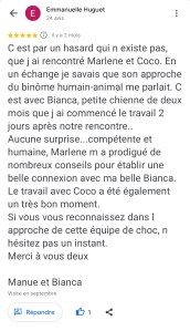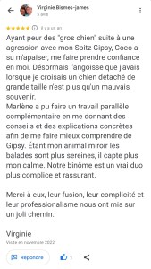« Ça faisait longtemps que je n’avais pas pris plaisir à sortir mes chiens. Et en même temps en plus ! Merci infiniment à Coco et à toi pour tout ce que vous avez fait pour nous. Cette rencontre a été un vrai cadeau. » F.