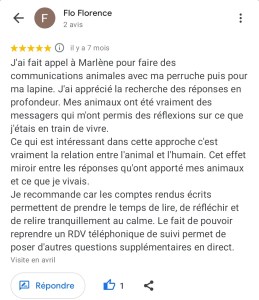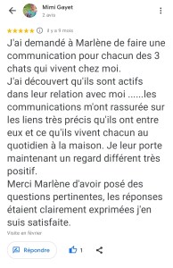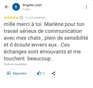 «J’ai été surprise par la compétence du travail effectué par Marlène. Le compte rendu, concernant la communication animale réalisée avec ma chatte Grisella était remarquable tant par son investissement que par les détails, la recherche et l’approfondissement des informations recueillies lors de la séance. C’est une personne avec une forte potentialité concernant la relation humain-animal. Merci encore pour cette belle communication. » Danielle.
