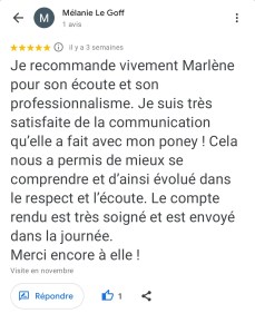 « Pour Balou la communication animale nous a vraiment fait du bien à tous les deux, on se comprend davantage et nos échanges sont bien plus fluides. J’ai réussi grâce à cette communication à trouver les origines de certains problèmes et j’en ai réglé la plupart, il reste tout de même un cheval délicat mais ça fait partie de son tempérament et puis ça n’a vraiment rien à voir avec le cheval qu’il était en arrivant à la maison. On a un lien très fort et particulier avec ce cheval. » Paloma.