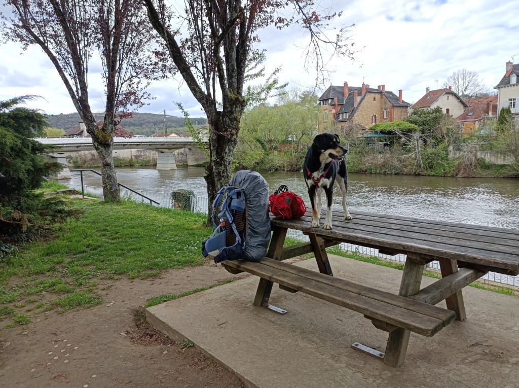 Bien arrivés à Figeac hier aprem’, le voyage en train/bus s’est très bien passé. Coco a été exemplaire de bout en bout ! Super Poupou qui a supporté la muselière pendant presque 3h sans râler, bravo. A présent bien installés chez Mathilde et Thomas pour cette douce transition. L’occasion d’accueillir et de vivre les émotions qui se bousculent au milieu du mental qui s’en donne à coeur joie ! Ça y va les peurs en pagaille… Ce matin petite sortie sans sac à dos sous un soleil radieux ! Je me suis posée sur un banc pour regarder les pèlerins matinaux passer… Ohlala, bientôt nous ! Je trouve difficilement les mots pour décrire mon état qui est un épais mélange de panique profonde et de sérénité nouvelle…! Il m’est très difficile de lâcher prise et de choisir la voix du coeur qui me souffle de partir tranquille car quoi qu’il arrive tout ira bien. Je réfléchis, je télécharge des cartes sur des applications en tout genre… Je stress et les peurs s’installent de plus en plus. C’est absurde, complètement absurde, je le sais mais c’est là. J’accueille, j’observe. Dans la vie il y a pourtant des faits, des décisions bien plus compliquées à prendre que celle de vouloir aller marcher cap vers l’Ouest !!! Partir en balade seule avec un chien, c’est pas la fin du monde… Quoi que ? La fin d’un monde, d’un chapitre de vie… Pendant ce temps c’est la guerre aux quatre coins du monde et des milliers de gens quittent tout à contre coeur… Et moi je me prends la tête sur un choix de vie en France, sur LE chemin le plus sécure qui soit ! Vie d’angoissée, je souhaite de tout cœur te laisser derrière moi…