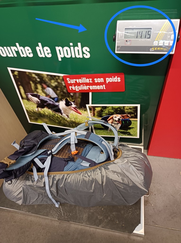 • Il porte 1kg de croquettes et 200g de poisson séché dans ses sacoches 🐕‍🦺💪 + 2 poches à eau d’1L vides (seront remplies s’il est opé pour les porter en plus !)