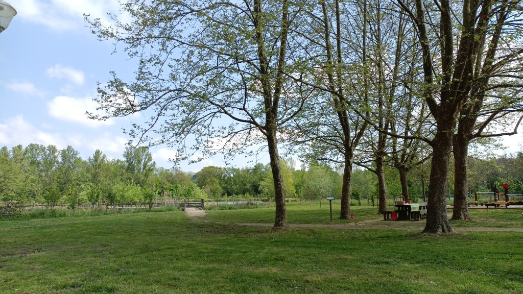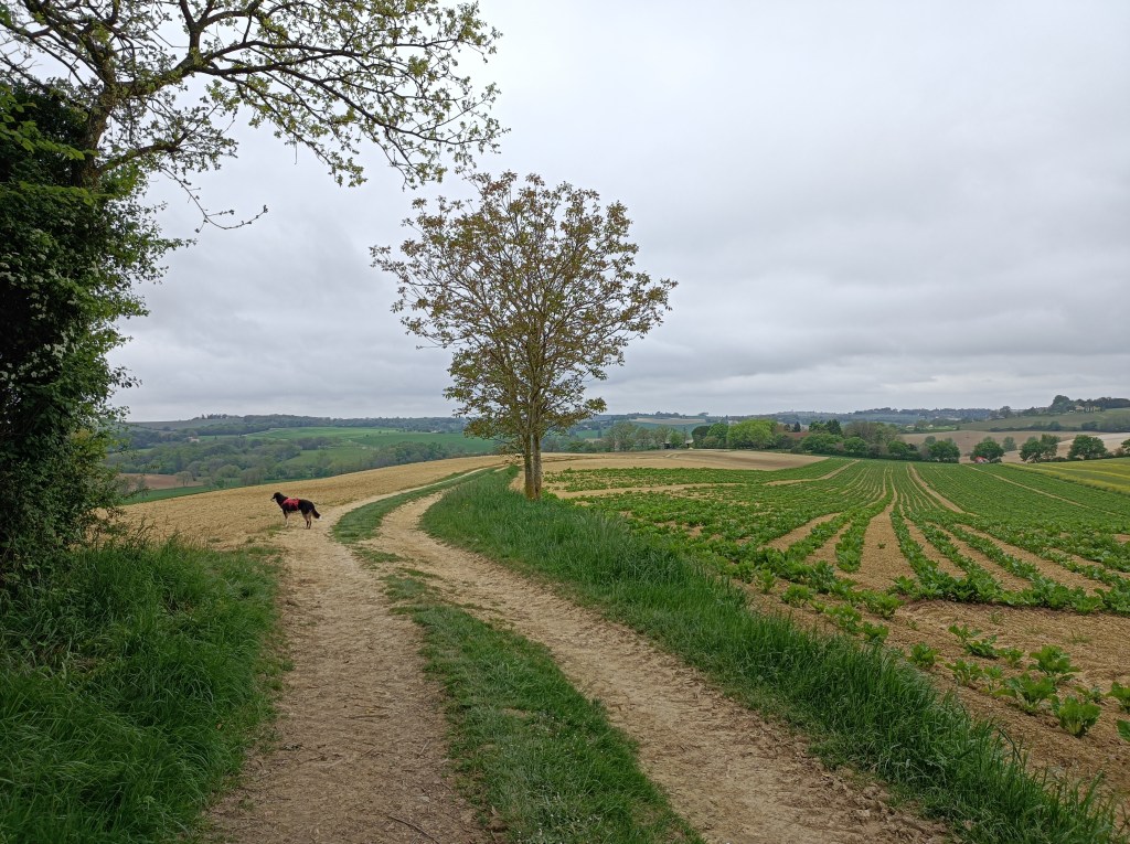 Nous sommes repartis tranquillement de Condom ce matin. Toujours à la fraîche ! Le temps est vraiment idéal pour marcher en ce moment : il fait gris et frais jusqu’à midi, après les éclaircies sont plus nombreuses et régulières, c’est parfait pour nous ! On profite du confort de la fraîcheur du matin et du soleil l’après midi quand on est posés. C’est parfait ! Il commence à y avoir du monde sur le chemin, nous étions nombreux à nous suivre aujourd’hui. Alors que je trouve que j’ai déjà un bon rythme de marche, certains courent presque dans les montées !! On a pas le même sac mais quand même ! Qu’ils me passent le numéro de leur coach sportif !!! Ce soir nous sommes installés à l’ancienne friche (devenue zone naturelle ouverte au public) de Montréal du Gers. J’ai suivi les recommendations de plusieurs personnes pour venir ici mais il semblerait que le samedi ne soit pas le meilleur jour pour y camper : beaucoup de passage et pas toujours agréable… Coco s’est fait attaquer par deux AmStaff, ça faisait longtemps… Quelques fumeurs de j***** qui mettent la musique mais assurent rester qu’un bref moment. A voire la nuit que nous passerons ici. J’ai voulu repartir mais Coco dort depuis une bonne heure déjà et je ne veux pas qu’il passe à côté de sa nuit. De toute façon demain nous nous reveillerons aux aurores : c’est l’ouverture le la pêche !!! D’ici là je regarde le renard et les chats faire leur petite vie autour de la marre. Tandis que les moustiques sont bien au rendez-vous, les grenouilles n’ont pas encore commencé à chanter (et c’est une excellente initiative !!). Aïe aïe aïe. J’avais oublié que le bivouac en bordure d’étang n’est pas une brillante idée à partir de cette période de l’année ! Demain je tenterai le Camping Municipal d’Eauze pour une douche et une lessive de culottes….
