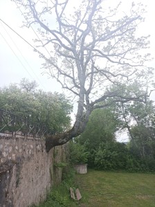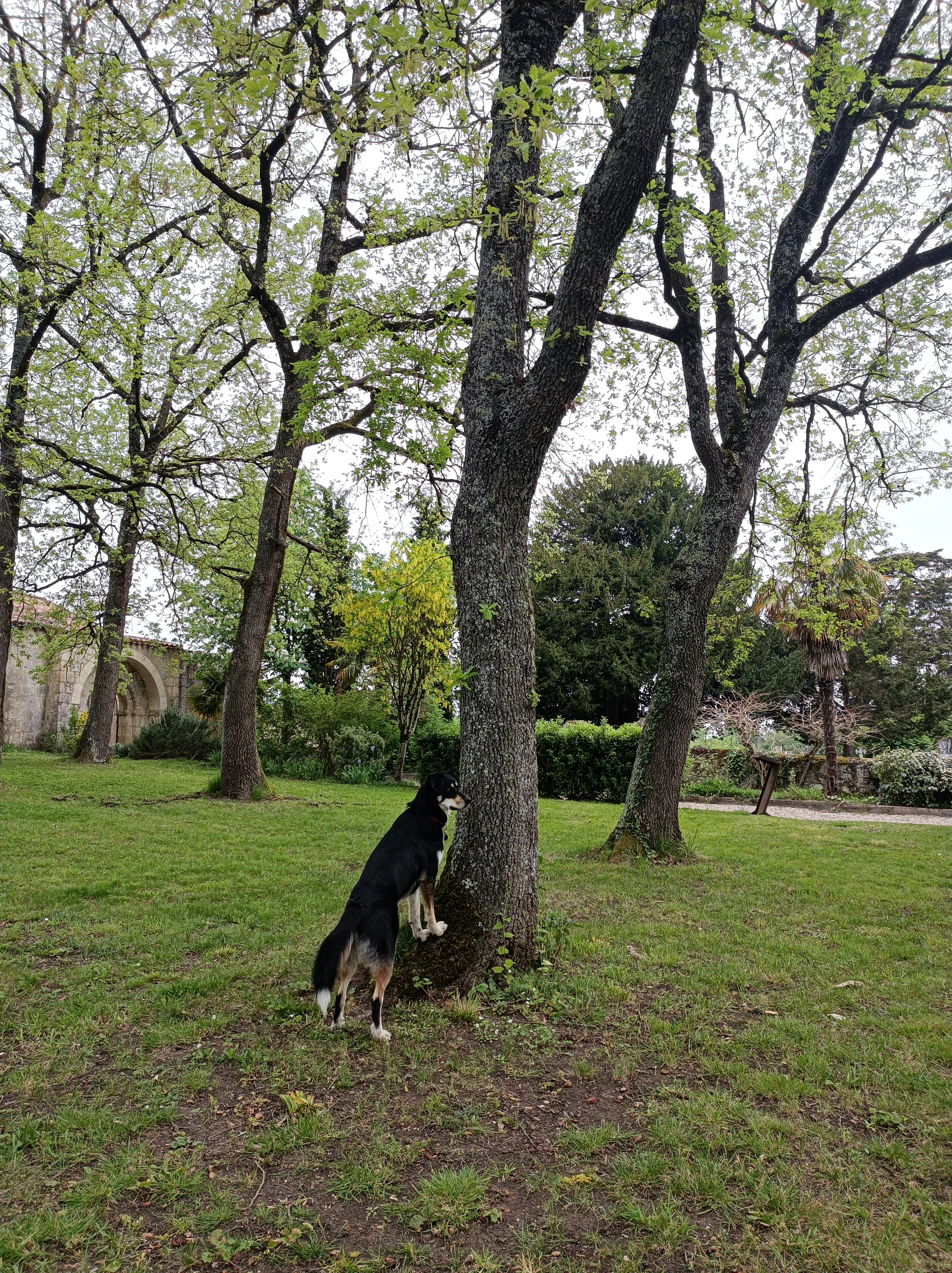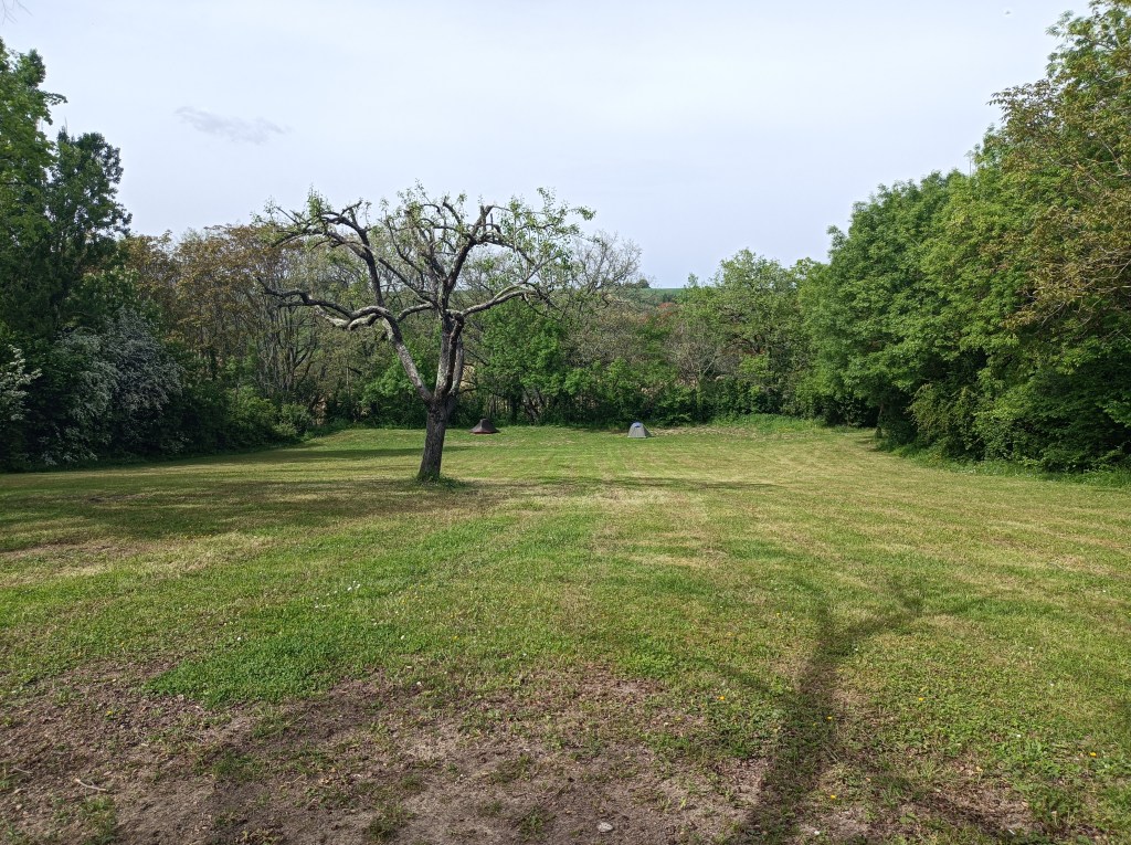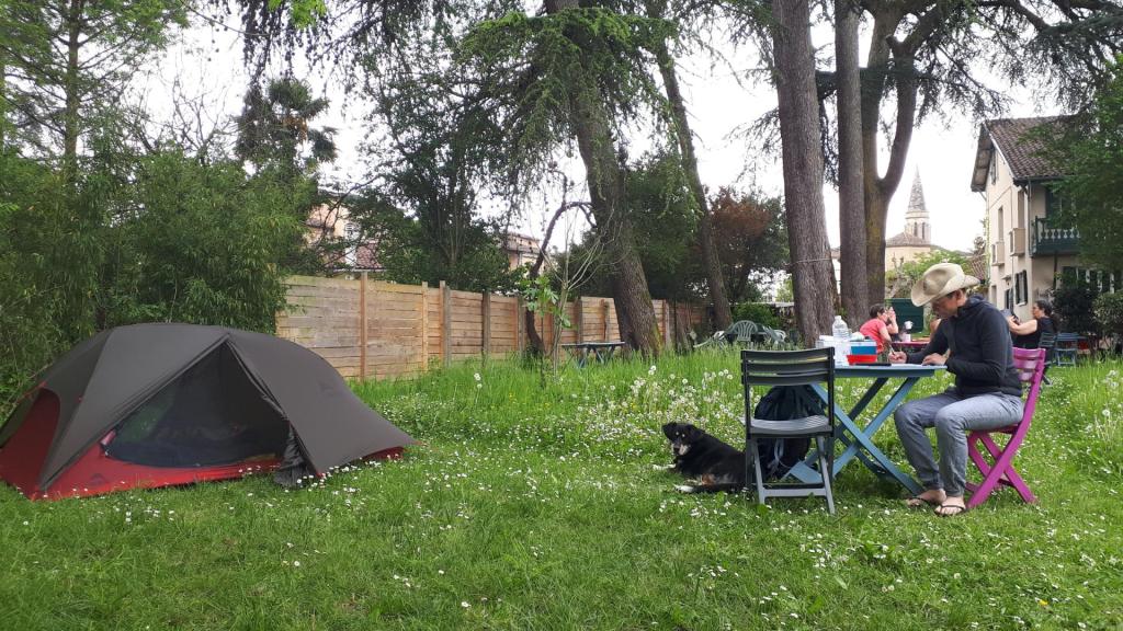 Une fois arrivés à Lectoure, de nombreux villageois nous ont indiqué le Jardin des Amandiers (ou Jardin de la Croix Rouge) pour installer notre campement car il y a de l’eau potable, des toilettes, une douche (que nous avons trouvée trop tard…) et les tentes y sont autorisées, le terrain étant d’ailleurs laisse à disposition exprès (terrain très pentu… mais c’est l’intention qui compte…!). Un arbre très original sortant d’un mur nous a interpellées ! Soirée bizarre cependant… C’est aussi ce soir là que Coco a déchiré une partie de la moustiquaire de la tente… Fatiguée, j’ai manqué d’attention lorsqu’il réclamait à aller se coucher et j’ai vu trop tard qu’il grattait la tente dans espoir de s’y faufiler pour se poser au chaud à sa place pour commencer sa nuit… Une bonne leçon pour moi.