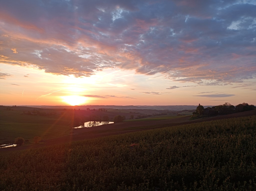 A Miradoux nous nous sommes installés aux abords du stade de foot. Point d’eau et toilettes accessible et… Apparition d’une douche chaude derrière une porte faussement fermée (astuce soufflée par un riverain ! Merci bien !!). Super coucher de Soleil et magnifique lever le lendemain matin. Pour repartir à la fraîche et se tromper de chemin dès le premier kilomètre… Un détour de quelques 800m, pas grand chose, mais sur une étape de 18km ça compte !