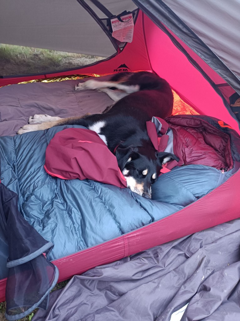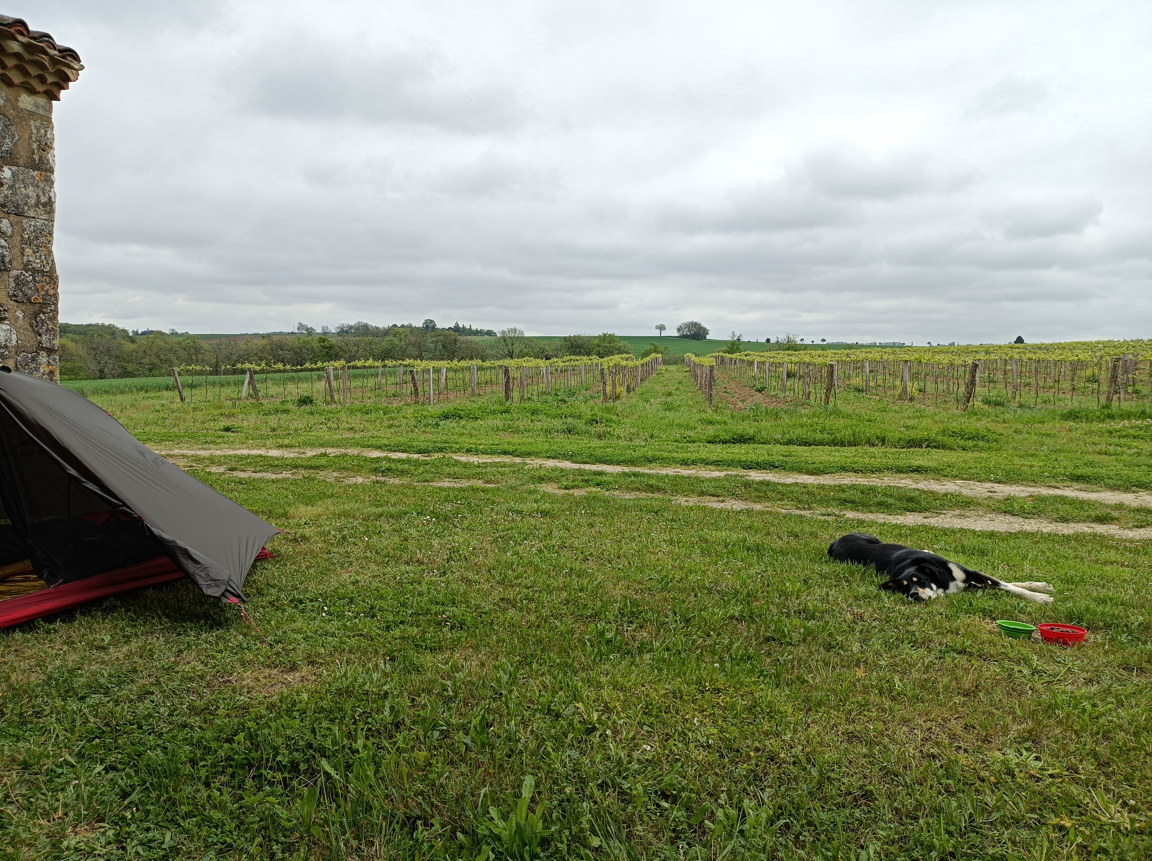 Le lendemain petite étape d’à peine 8km pour atteindre Condom. A l’entrée de la ville nous trouvons une place au fond du jardin du gîte du Champ d’Etoiles où Jean-Marc et Véronique acceptent les chiens mais seulement à l’extérieur. La tente est plantée dans un petit coin au bord du ruisseau. C’est le moment de faire une pause confort : douche chaude, tisanes, lessive (y avait bien besoin après une semaine…..) et toilettes bien venues pour le premier jour de mes règles. A voir comment je vais vivre ça en bivouac… Petite visite de la ville et des épiceries ou je refais le (trop) plein de pique nique. J’achète un pantalon de survet’ dans la friperie du secours catholique. Plus confortable qu’une simple et unique culotte sous un poncho pour attendre que le linge sèche ! (Une amie de Véronique m’a prêté des vêtements pour que je puisse profiter de la ville en attendant le retour de tout mon linge. Vraiment sympa car la meteo n’était pas au plus efficace pour le séchage ! Les habitants et commerçants de Condom sont très accueillants et agréables c’était un super moment : Coco recevait une gamelle d’eau quand on s’arrêtait devant un commerce, le boucher lui a découpé une tête de fémur (histoire de rajouter un peu de poid dans le sac…!) Il était ravi et cette surprise maximale était bien venue après les soins des pattes ! J’ai aussi rencontré l’un des gérants de la boutique Caminoloc (je n’ai pas retenu son prénom, ou alors je ne l’avais pas demandé…) qui est parti un an et demi sur le Chemin et qui, lorsque je lui ai demandé ce que cette expérience lui avait apporté de plus beau, m’a répondu : « Ça a sauvé ma vie. » Merci à lui pour ce partage si fort en émotions…