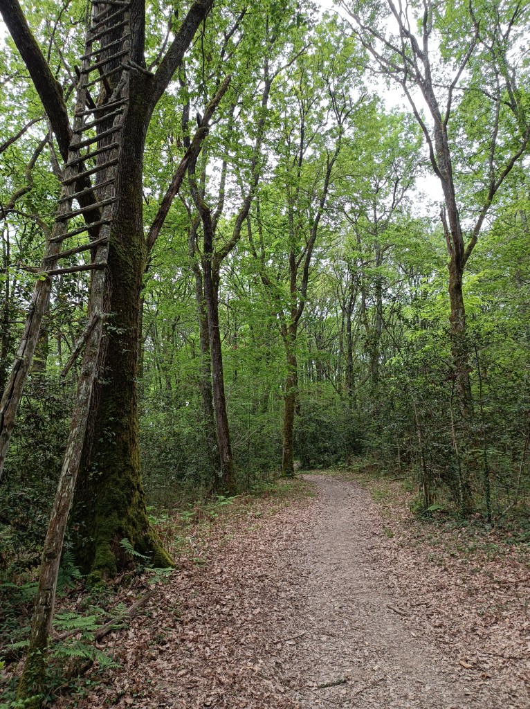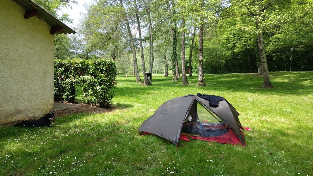 Ce soir nous faisons halte à Lelin Lapujolle où la mairie accepte les tentes dans un petit coin d’herbe plat, à proximité des tables de pique nique et des sanitaires. On vois passer des pèlerins qui s’arrêtent une minute, boire, manger, aller aux toilettes. C’est sympa comme ça aussi et je révise mon anglais lors de ces échanges courts mais plaisants. J’ai rencontré Helen qui a commencé son chemin depuis chez elle en Allemagne ! Elle a renvoyé sa tente et ses vêtements d’hiver hier, pour cause de sac tellement trop lourd, comme je comprends… j’aimerais réussir à faire du vide moi aussi, mais j’utilise tout, et je suis bien contente d’avoir une tenue de rechange finalement. Ça m’évite d’être nue sous mon poncho de pluie en attendant que le linge se lave et se sèche…! Pendant que Coco alterne sieste et chasse aux rapiettes, je profite d’un instant de solitude, d’une table de pique nique et du wifi de la mairie pour écrire un petit article. Globalement je trouve que les journées passent vite, pourtant j’ai l’impression de rien faire de particulier à par marcher le matin et installer le campement l’après midi… Écrire dans mon journal, laver une culotte, écouter les oiseaux, visiter les alentours, respirer les fleurs… C’est sympa de marcher comme ça au printemps ! Aujourd’hui le chemin était plus nature et surtout plus boisé, ça fait vraiment plaisir après toutes ces étendues d’agriculture… Nous repartirons tranquillement demain matin pour traverser Aire sur l’Adour et poursuivre le Chemin à notre rythme, selon nos envies et notre bien être physique.