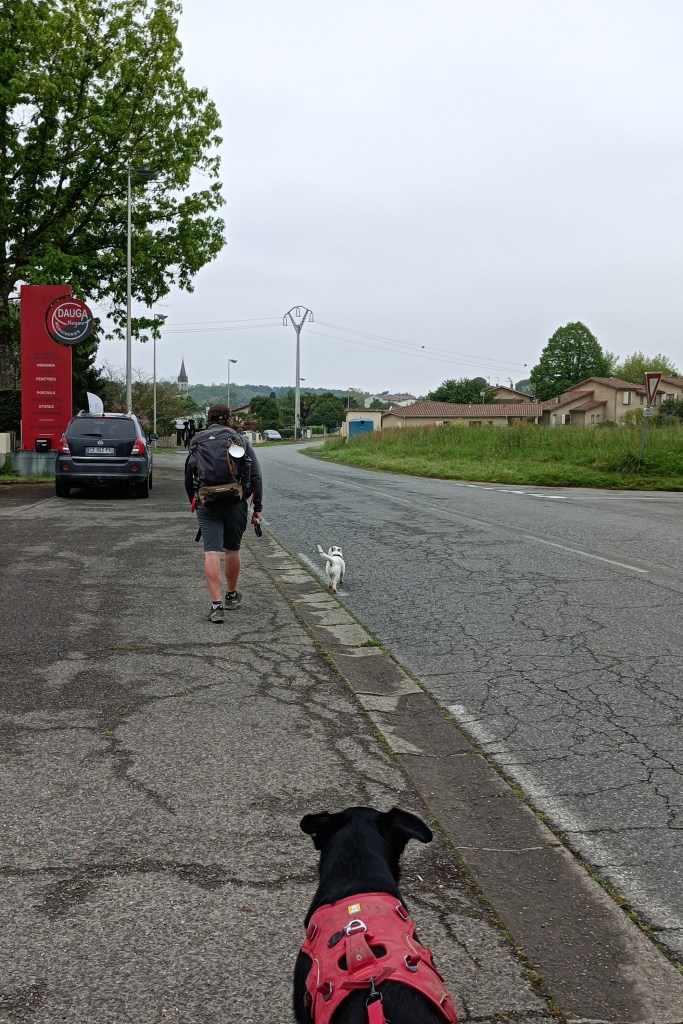 C’est là qu’un villageois vient me proposer de nous conduire en voiture à Nogaro. Un peu perdue je ne sais quoi répondre : Compostelle, voiture… Pas pour nous ! Puis je me suis souvenu du jeudi pourri où j’ai refusé cette proposition, où je me suis fait mal au genou, où Coco a souffert de tant de kilomètres parcourus, où nous avions dû nous arrêter quatre jours à Moissac pour nous reposer… J’ai accepté. Comme ils ont un chien aussi, ça ne gênait pas que Coco s’installe tout fier sur les sièges arrière ! Ça va plus vite en voiture c’est sûr ! En 5min nous étions sur le parking du supermarché. J’ai refait le plein de pique nique puis nous sommes allés frapper à la porte du gîte communal pour prendre une chambre. Je ne sais pas pourquoi j’ai répondu « chambre » à la question « tente ou chambre » mais quand il s’est mis à bien pleuvoir en fin de journée, j’était ravie d’avoir prononcé le mot « chambre » ! Une bonne nuit de repos, très bien installés dans une chambre individuelle. Douche chaude, lessive, repas chaud, tisanes à volonté… De l’isolement et du silence pour Coco. Voilà le confort dont nous avons besoin pour nous sentir bien. L’occasion de nous socialiser un peu avec les autres pèlerins. Ça parlait pas mal allemand, j’étais un peu larguée avec mon anglais approximatif…! Mais c’était une chouette soirée où nous avons rencontré, entre autres, Peter de la télévision Suisse, Allan qui marche avec une petite chienne de 9 ans bien vaillante, Daniela et Anita deux magnifiques personnes avec qui nous avons fait un bout de Chemin… Coco adore manger avec les allemands qui laissent souvent quelques Knackis traîner en fin de repas….! Et j’ai très bien dormi, ce qui est une fête en soi !!!
