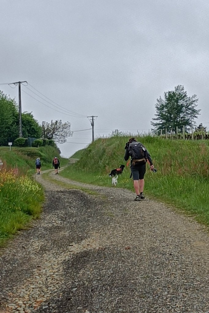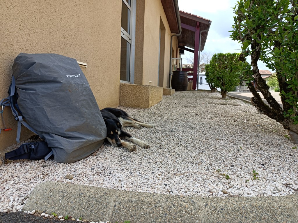 Je me suis rendu compte qu’il est plus pertinent de faire halte après les villes plutôt qu’avant car le matin nous partons trop tôt et à l’heure où nous les traversons les commerces ne sont pas encore ouverts pour acheter le pique nique… Je m’organiserai différemment maintenant même s’il n’y a pratiquement plus de ville sur Le Chemin d’ici à la frontière ! Hier était une journée particulière. Ça fait deux jours que je trouve les étapes difficiles alors que nous faisons principalement du plat et qu’il fait gris le matin (bon pour le physique mais peut être moins pour le moral ?) et Soleil dès 14h (la météo est vraiment parfaite pour nous !). J’avais prévu une halte près d’une petite chapelle dite de L’Hopital. A peine une dizaine de minutes après notre arrivée j’ai vite constaté que nous étions nombreux à avoir prévu de déjeuner ici : première fois avec autant de monde, nous étions une bonne vingtaine à grignoter tous ensemble ! De nouvelles rencontres et un peu d’ambiance pèlerine ! L’occasion pour Coco de finir les restes de pique nique… Et de ne pas faire sa sieste ! Un riverain nous a branchés sur un petit village à 2,5km du Chemin : Sainte Christie. Il nous a vendu du rêve donc j’ai décidé que nous pourrions camper là bas, sur l’aire mise à disposition exprès par la mairie. Bon. Ça vallait le détour, c’est joli, mais camping interdit… Un peu navrée et fatiguée je constate que Coco ne veut plus continuer, il est dans sa sieste, et que je n’ai pas d’autre plan eau pour le bivouac du jour. De toute façon, 20km c’est bien assez pour moi aussi car le sac me pèse et le dos et les épaules en pâtissent lourdement, c’est le cas de le dire. Je décide de m’assoire et de ne rien faire, parce que je ne savais pas quoi faire de toute façon !